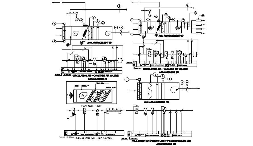Circulating air and constant air volume arrangement details are given in this 2D Autocad DWG drawing file.  Download the 2D Autocad drawing file.