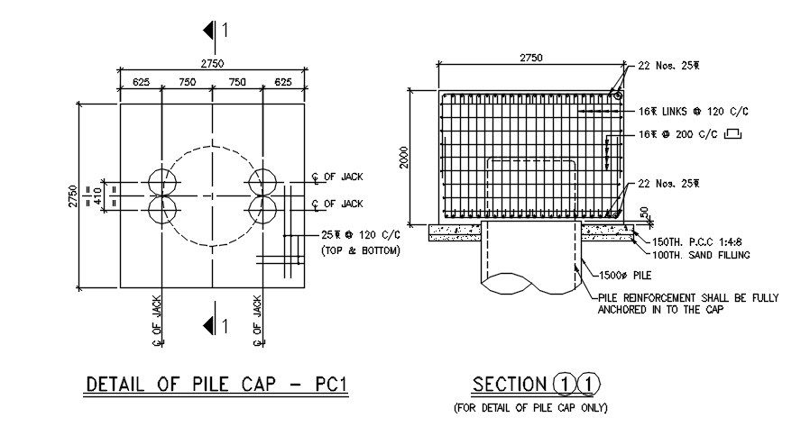 AutoCAD plan describing detail of a pile cap. Reinforcement details of the pile cap encompassing main bar dimensions, lateral tie specifications are provided. Download the DWG file from our website for detailed analyse.