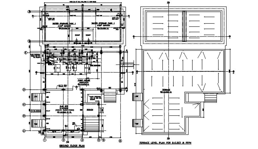 AutoCAD Ground floor plan and terrace level plan of a pump house is described. General arrangement of divisions DG set, porch, water storage tank, pipe supports designed as par to standard requirements. Download the DWG file from our website for detailed analyse.