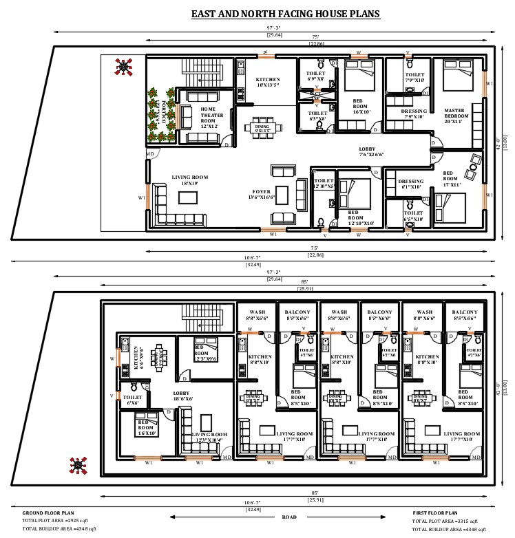 75'X39' East and north facing house plan as per Vastu Shastra.The total Plot area of this house plan is 2925 sqft. 4 bedrooms and home theater is available in the ground floor.one 2bhk and three 1bhk houses are available on the first floor. The staircase is placed in the southeast direction outside of the house. Download Autocad DWG and PDF file.