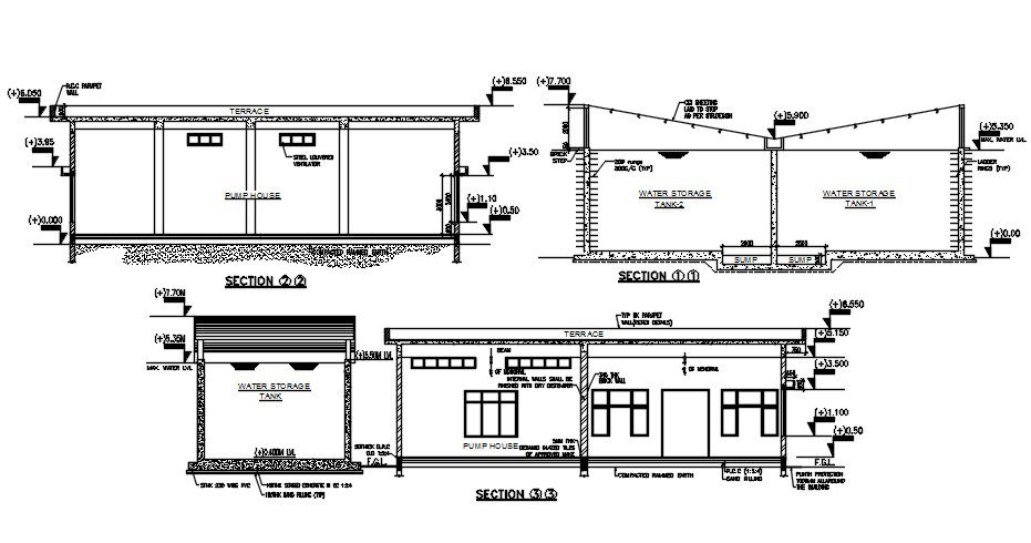 Elevation and section detail of Pump house and water tank. Download the AutoCAD 2D file.