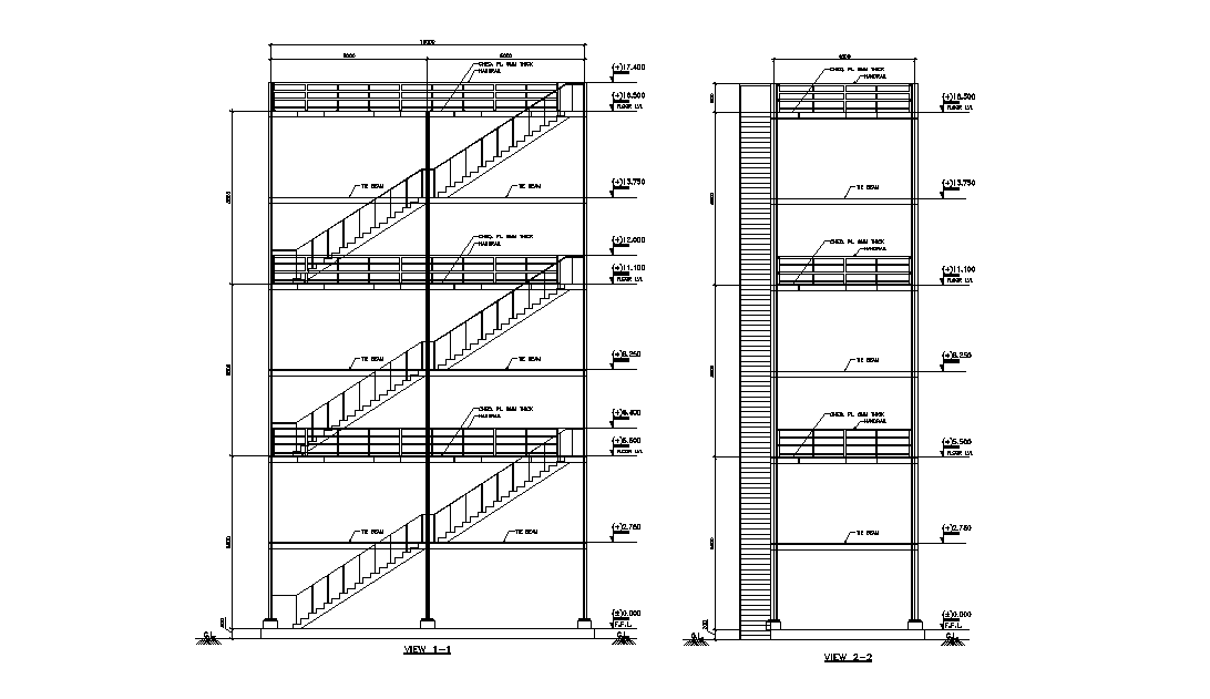 AutoCAd layout of Staircase elevation detail of a hydro-generator building. The FFl and FGl are mentioned, designed according to standards of safety and stability. For detailed analyse of dimension download AutoCAD DWG file from our website.