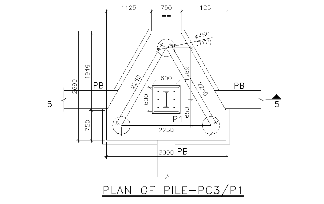 AutoCAD diagram showing plan all physical features and elevations in pile design. Cross sectional dimensions, plinth beam details, supporting column details and other structural aspects are clearly mentioned. Download the DWG file from our website.