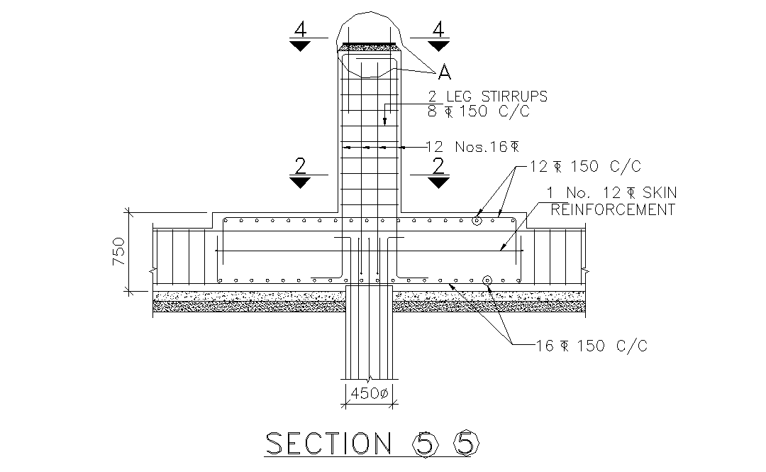 AutoCAD diagram showing reinforcement plan of all physical features and elevations in pile design. Cross sectional dimensions, skin reinforcement, leg stirrups details and other structural aspects are clearly mentioned. Download the DWG file from our website.
