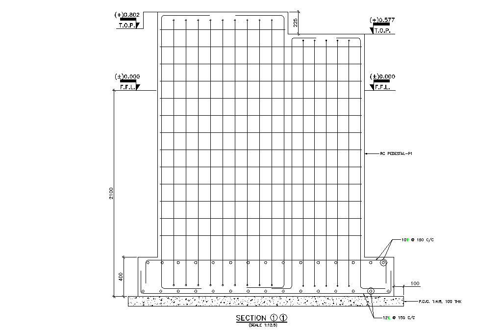 AutoCAD diagram describing Sectional plan of foundation of the Hydro generator building. Longitudinal and traverse reinforcement, material specification, size and thickness of footing and other structural elements of foundation are designed as par to standard referrals. Download the DWG file from our website.