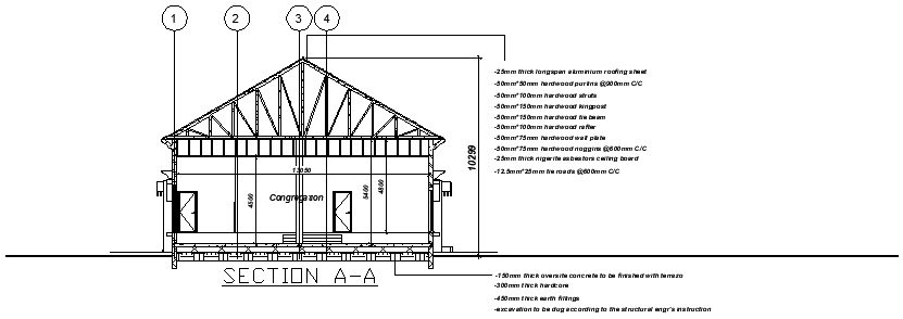 A Section view of the simple church design is given in the form of 2D AutoCAD DWG drawing file. The total height of church is 10m. Doors and beam members are mentioned in this drawing file. 25mm thickness of long span aluminum roofing sheet, 50x50mm hardwood purlins, 50x150mm hardwood tie beam etc., mentioned in this drawing file. Download the 2D AutoCAD DWG drawing file. Thank you for downloading the 2D AutoCAD DWG drawing file and other CAD programs from our website.
