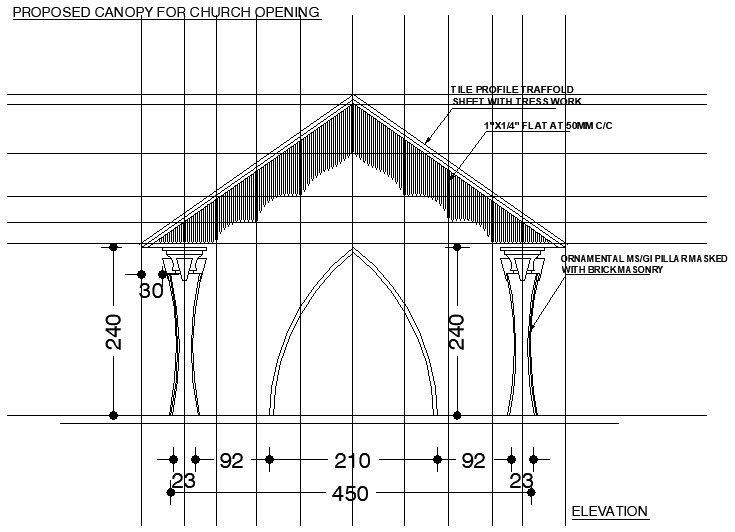An Elevation of simple church is given in the form of 2D Autocad DWG drawing file. Proposed canopy for church opening is mentioned. Tile profile traffold sheet with tress work, 1”x0.25” flat at 50mm cc, ornamental MS GI pillar masked with brick masonry is specified. Download the 2D Autocad DWG drawing file. Thank you for downloading the 2D AutoCAD DWG drawing file and other CAD programs from our website.