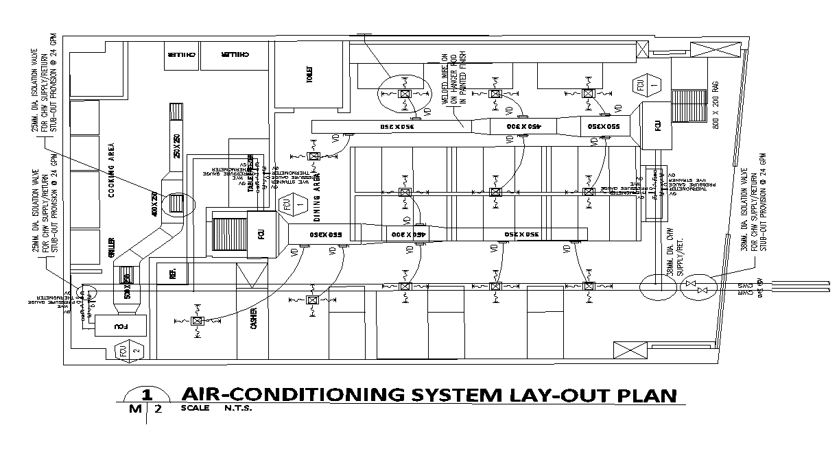 Airconditioning system layout plan defined in this AutoCAD file. this file consists of an air condition system with all pipeline detail with dimensions, and area specifications also. this can be used by architects and engineers. Download this 2d AutoCAD drawing file.