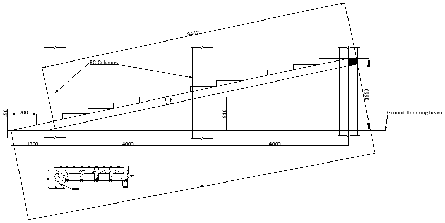 2D Autocad DWG drawing file has the detail of church staircase. The length of the staircase is 9200mm. The centre to centre distance of each column is 4000mm. In this ground floor ring beam is provided. 3 RC columns are mentioned in this staircase. For more details download the drawing file. Thank you for downloading the 2D AutoCAD DWG drawing file and other CAD program files from our website.