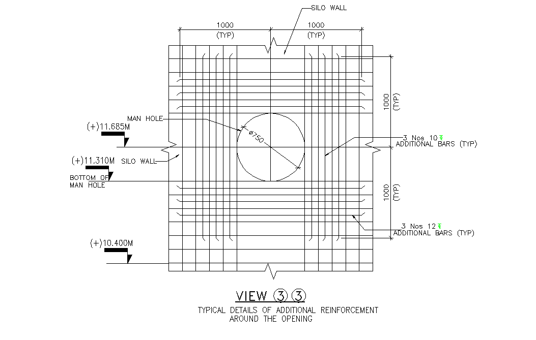 Typical details of additional reinforcement around the opening defined in this AutoCAD file. Download this 2d autocad drawing file.