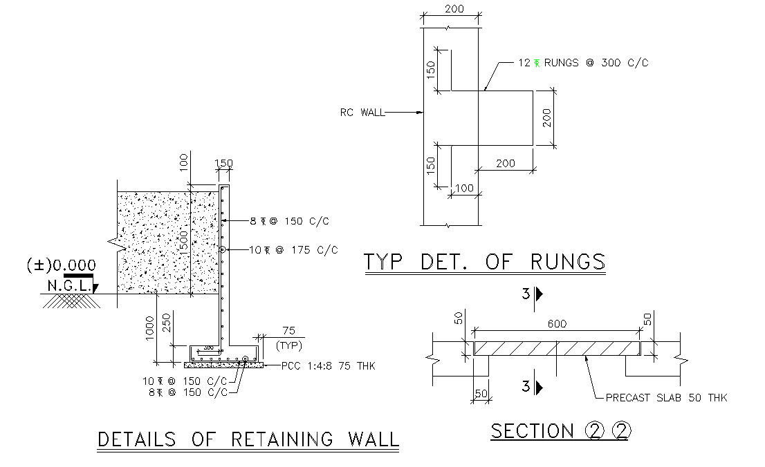 Detail of the retaining wall drawing provided in this AutoCAD file. this file consists of retaining wall, rungs detail, section detail given with detailed dimensions and specifications. this can be used by architects and engineers. Download this 2d AutoCAD drawing file.