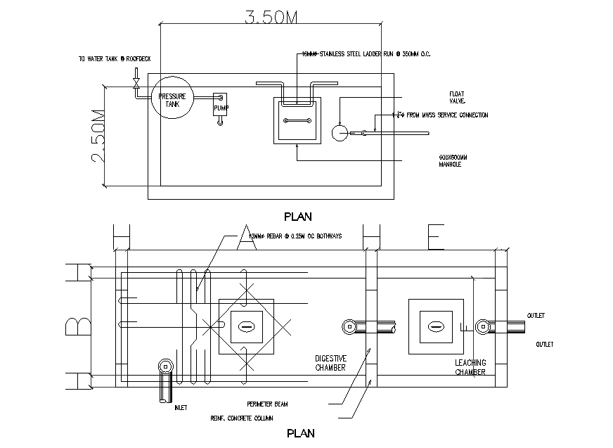 The water tank plan CAD drawing that shows 2.5X5 meter tank size with inbuilt water pump motor, stain less steel manhole, and leaching chamber box for outlet water. Thank you for downloading the AutoCAD file and other CAD program from our website.