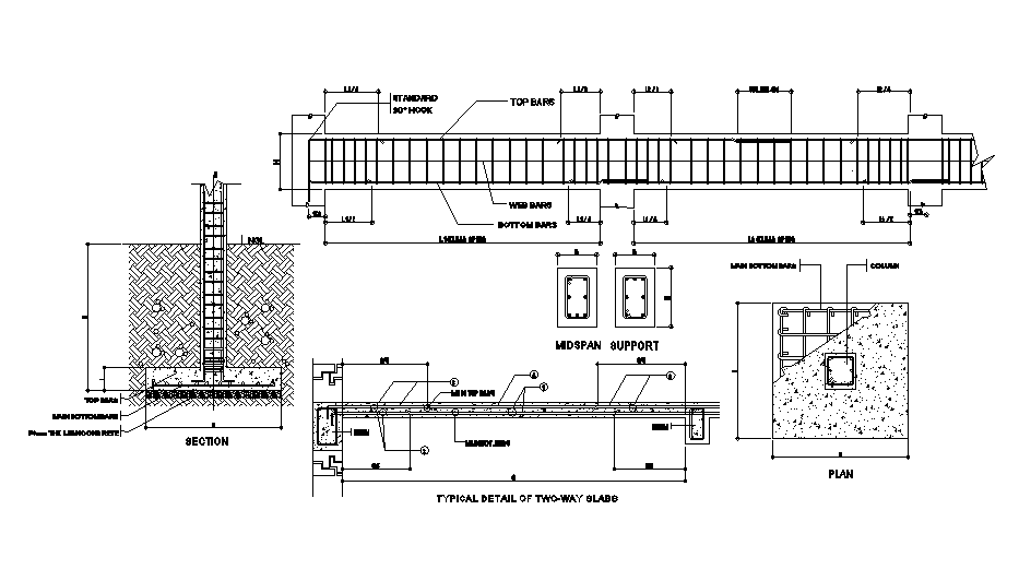 The Reinforcement Column, Beam Slab Bar Section Drawing that shows typical detail of two-way slabs, top bars, wall footing main bottom bars, and 50mm thk lean concrete. also has reinforcement schedule of footing, column and slab detail, typical detail of two-way slabs. Thank you for downloading the AutoCAD file and other CAD program from our website.