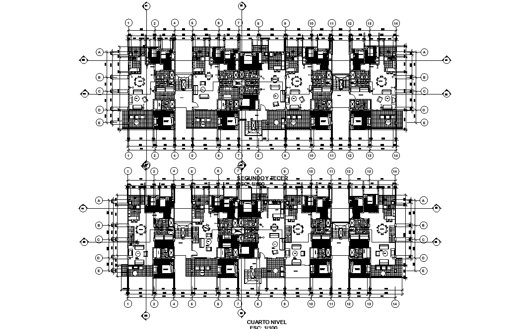 Plan of 4 house is given in this 2D Autocad DWG drawing file. Download the 2D Autocad DWG drawing file.