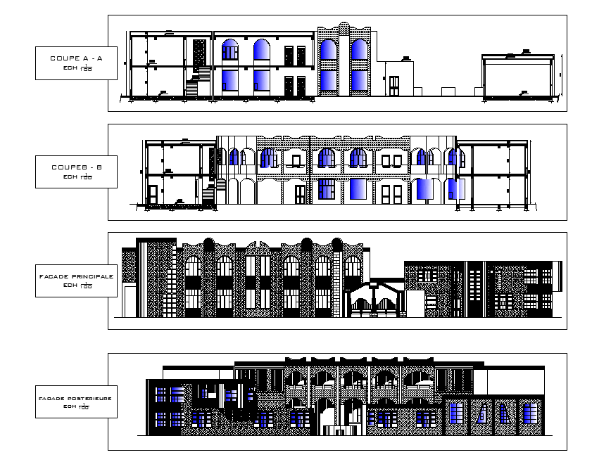 Front and rear elevation of the building is given in this 2D Autocad DWG drawing file.