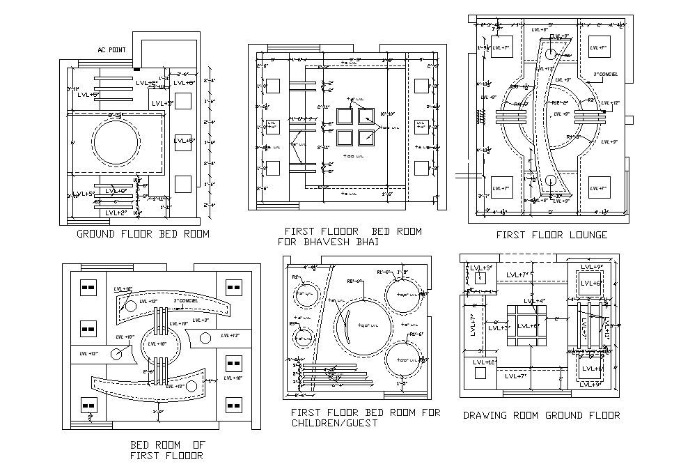 Ceiling details of the each room of bungalow house is given in this Autocad DWG drawing file. Ground floor bed room, first floor bed room, first floor lounge, bed room of first floor, first floor bed room for children’s or guest and drawing room ground floor details are given clearly in this drawing model. For more details download the Autocad DWG drawing file. Thank you for downloading the 2D AutoCAD DWG drawing file and other CAD program files from our website.