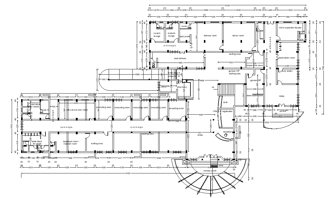 Ernakulam hospital building plan details are given in this 2D Autocad DWG drawing file. Delivery room, labour room, baby wash room, doctor lounge, nurse’s longue, observation room, waiting area, minor operation theatre room, preparation room, gyneac OP waiting area, duty doctor room, lobby, post delivery room, consulting room, treatment room, reception room, and toilets are provided in this plan. Other details are given in this drawing model. For more details download the Autocad DWG drawing file. Thank you for downloading the 2D AutoCAD DWG drawing file and other CAD program files from our website.