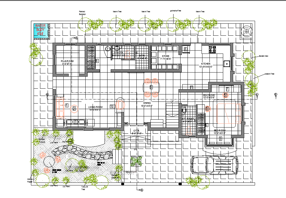 Fantastic bungalow house plan is given in this 2D Autocad DWG drawing file. Otta, children’s bedroom, Water closet, Verndha, car parking, store, kitchen, drawing room, and master bedroom with attached toilet and dressing room, dining, puja room, garden, path way stone, garden sitting of cane, water body and common toilets are available. Amazing gardening is provided in this plan. For more details download the 2D Autocad DWG drawing file. Thank you for downloading the 2D AutoCAD DWG drawing file and other CAD program files from our website.