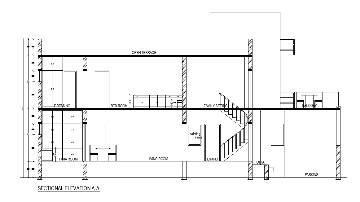 Sectional elevation view of the bungalow house is given in this Autocad drawing file. Puja room, living room, bedrooms, dining, painting frame, otta, parking, balcony, dressing room, open terrace and family sitting room are mentioned in this drawing file. For more details download the 2D Autocad DWG drawing file. Thank you for downloading the 2D AutoCAD DWG drawing file and other CAD program files from our website.