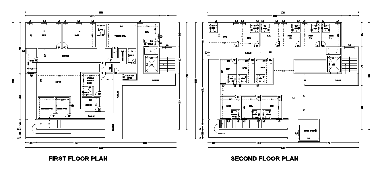 First floor and second floor plan of the hospital building is given in this 2D Autocad DWG drawing file. Machine room, store room, surgical doctors room with attached toilet, doctors room, theatre room, dress changing room, passage are provided at the ground floor plan. At third floor, nurse station, Passage and patients room with attached toilets are provided. For more details download the 2D Autocad DWG drawing file. Thank you for downloading the 2D AutoCAD DWG drawing file and other CAD program files from our website.