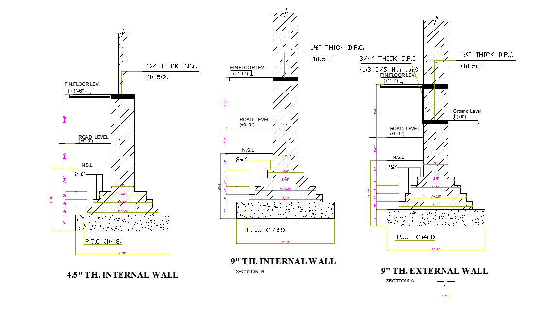 Internal and external wall of footing details are given in this 2D Autocad DWG drawing file. Thickness of internal wall1, 2 and external wall is 4.5”, 9” and 9” respectively. Road level are mentioned for the all walls. 1:4:8 PCC were provided for all walls. Fine floor levels also mentioned for the all walls. Thank you for downloading the Autocad file and other CAD program files from our website.