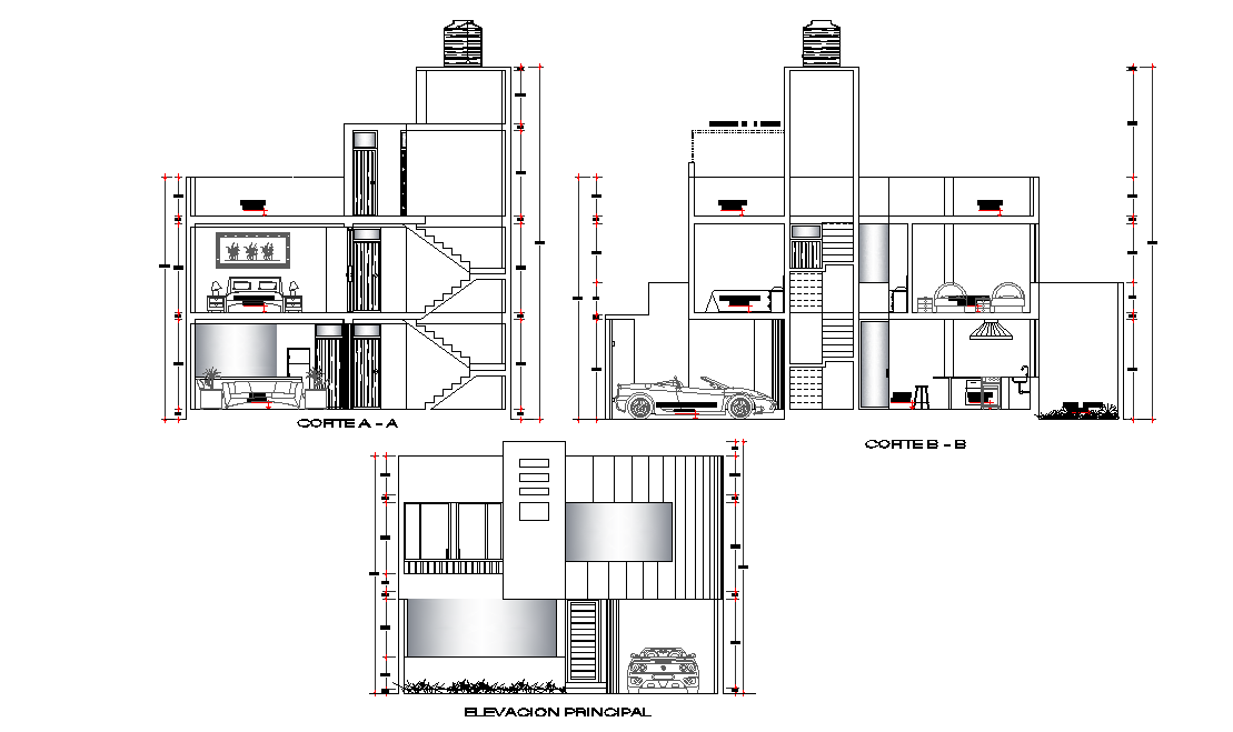 Corte and elevacion principal of duplex house details are given in this 2D Autocad DWG drawing file. Living hall, car parking, staircase, water tank, bedrooms, lift, doors and windows are mentioned in this drawing model. This is duplex house. Other details are given in this drawing file. Thank you for downloading the Autocad file and other CAD program files from our website.