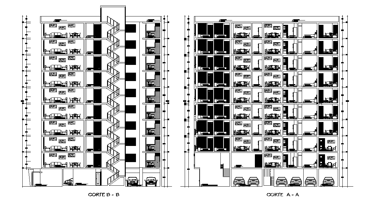 Elevation of the G+9 apartment building is given in the form of 2D Autocad DWG drawing file. Download the 2D Autocad DWG file.