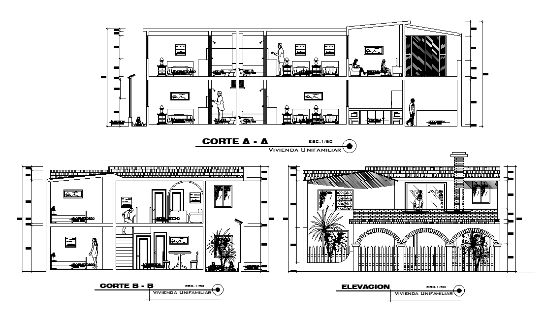 Section and elevation of the duplex house plan is given in this Autocad drawing file. Download the 2D Autocad DWG drawing file.