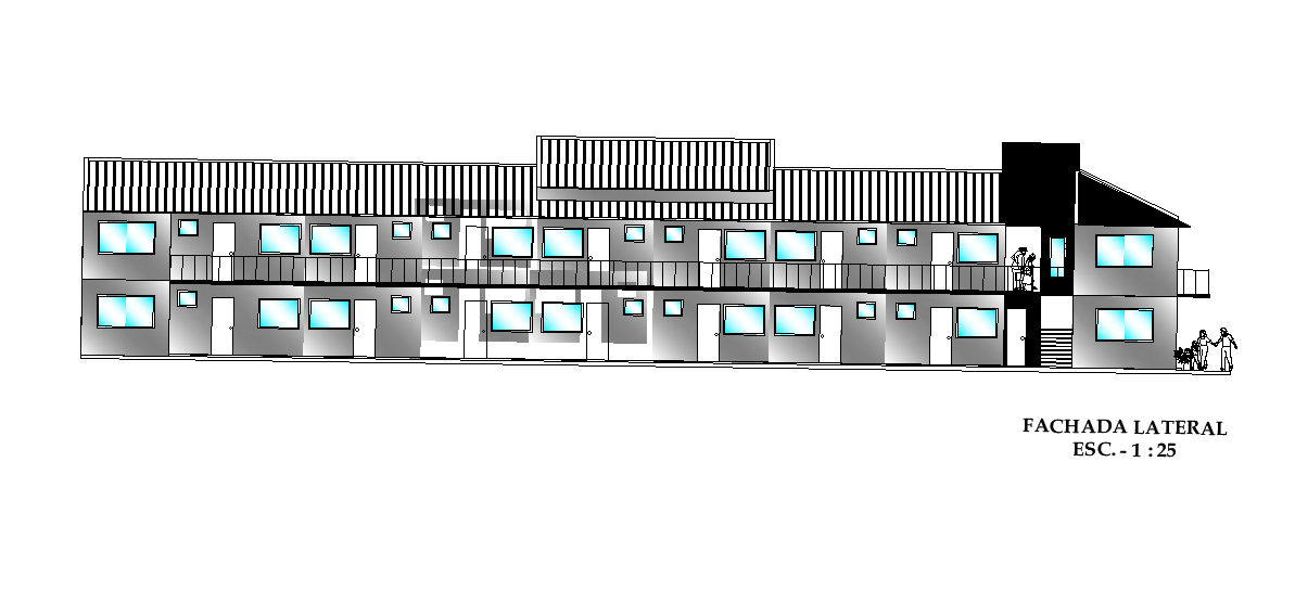 The Hotel building Side elevation design that shows 2 storey floor level bedrooms building model design which consist door window marking, bobby with railing wall and roof detail. also has use some AutoCAD hatching design for improve the CAD presentation. Thank you for downloading the AutoCAD file and other CAD program from our website.