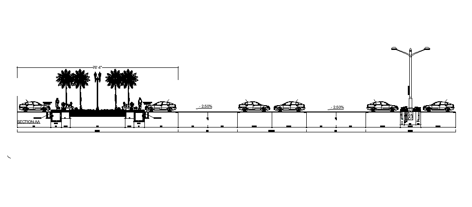 Road section detail drawing presented in this AutoCAD file. this file consists of car parking, street detail as sitting zone separately given with dimensions and specifications. this can be used by architects and engineers. Download this 2d AutoCAD drawing file.
