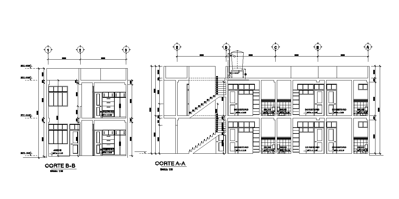 Sections of housing in morales are given in this Autocad drawing. The length and breadth of the plan is 17m and 8m respectively. First floor and second floor details are given. This is consists of dining room, bedrooms, water closet, bathroom, garden and staircase are mentioned in this drawing model. There are 8 bedrooms available in this house. Download the 2D Autocad drawing file. Thank you downloading the 2D AutoCAD DWG drawing file and other CAD program files from our website.
