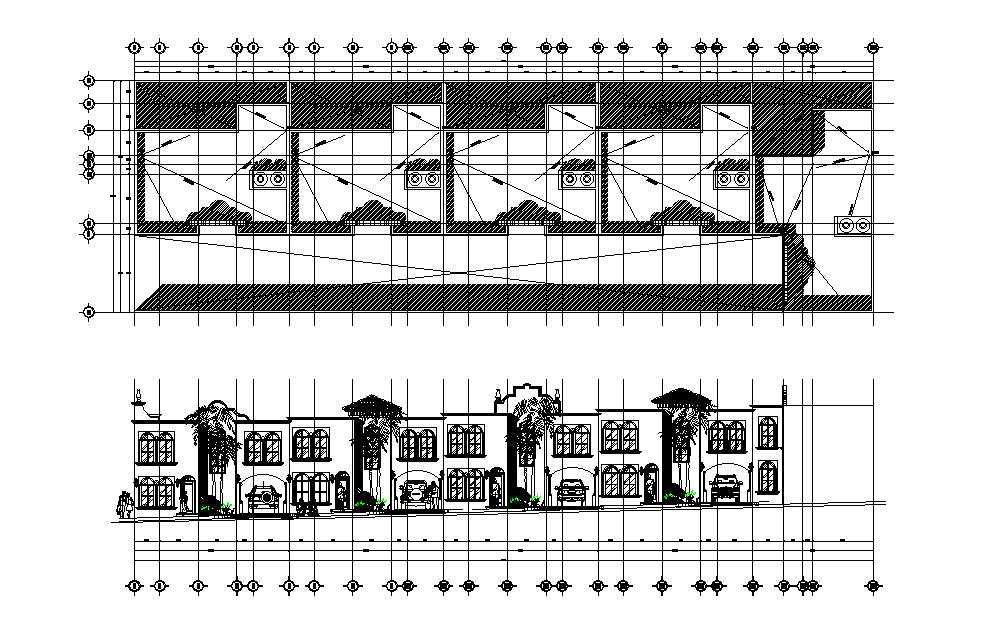 Front elevation of the 47x15m row house plan is given in this 2D Autocad DWG drawing file. Download the Autocad DWG drawing file.