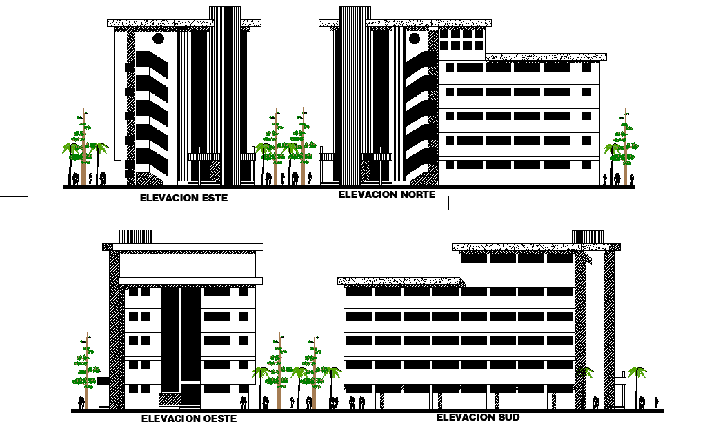 Autocad 2D drawing file has the elevation details of hospital plan. This is five storey building. In this elevation drawing trees, doors, windows, front glasses and other details are mentioned. Staircase and ramp is provided. Download the 2D Autocad drawing file. Thank you downloading the 2D AutoCAD DWG drawing file and other CAD program files from our website.