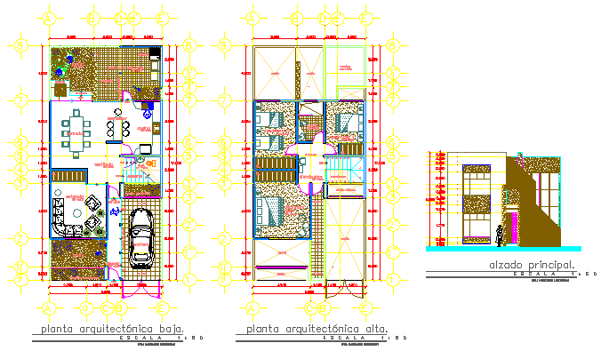 This is a Residential house design drawing with ground floor and first floor design and furniture layout also show in this auto cad file and elevation of front view draw in this auto cad file.