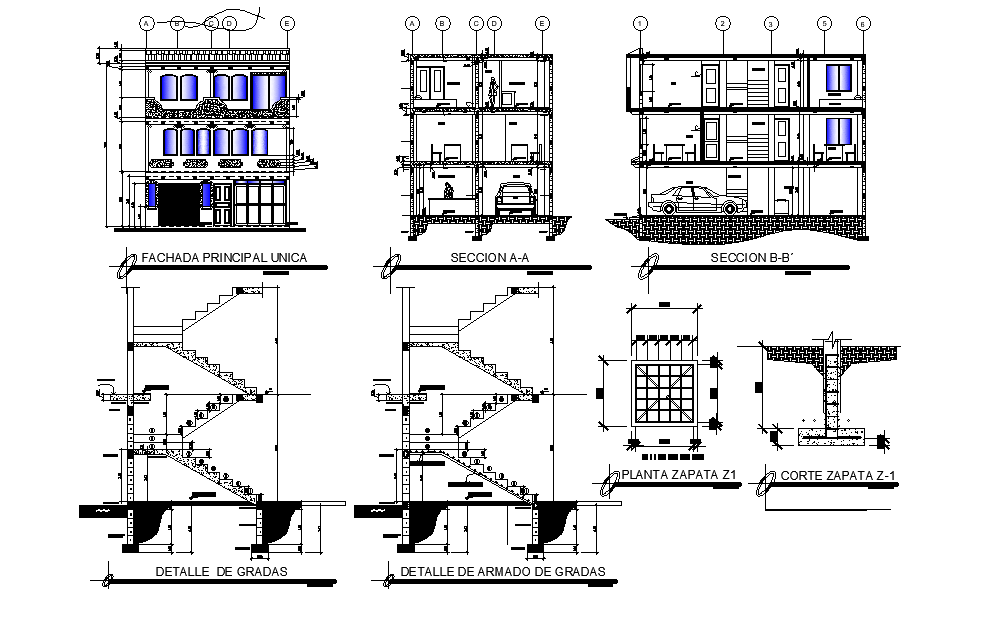 The G Two Storey House Plan AutoCAD Drawing provides an accurate and detailed architectural layout featuring section and elevation views of a modern residential building. The design highlights Section A-A and Section B-B, illustrating critical structural elements such as car parking area, dining space, main entry, and staircase layout. The drawing also includes precise column positioning, roof level references, and staircase reinforcement details that ensure technical reliability and visual clarity. Each component is labeled and dimensioned to provide architects and engineers with a clear guide for project execution and structural accuracy.