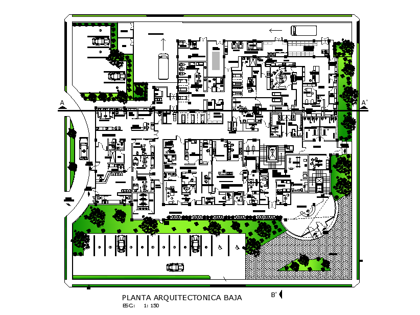 Hospital plan of low architectural floor is given in this 2D Autocad drawing. Download the Autocad file.