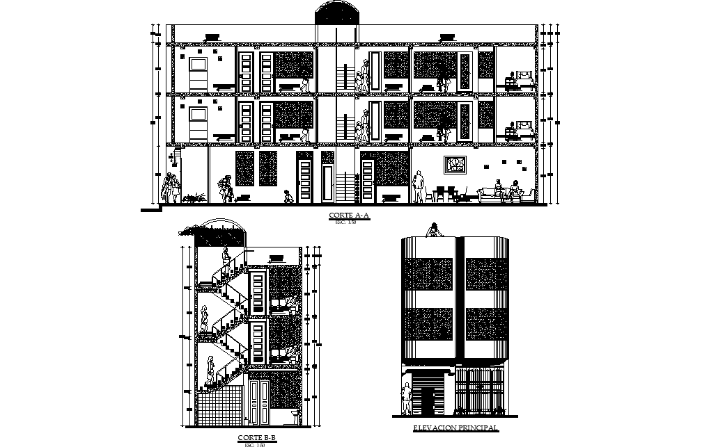 Elevation and section of the multi family house building is given in this Autocad drawing.