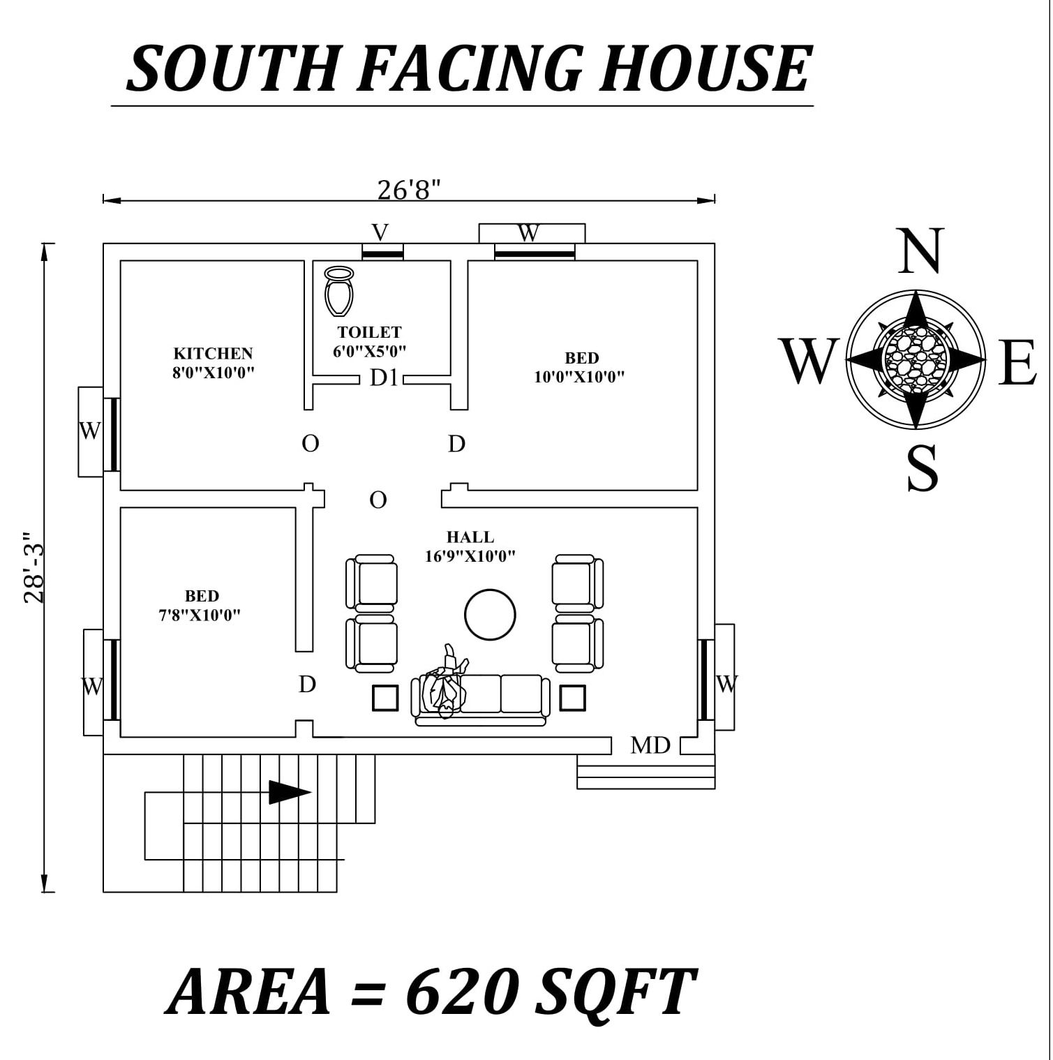 26'X28' South Facing home plan as per vastu shastra are available in this Autocad drawing. The total Buildup Area of the plan is 620SQFT. In this simple plan Kitchen, master bedroom, kid's bedroom, common toilet, living room, portico, are available. The staircase is placed outside of the house. Download the AutoCAD file.
