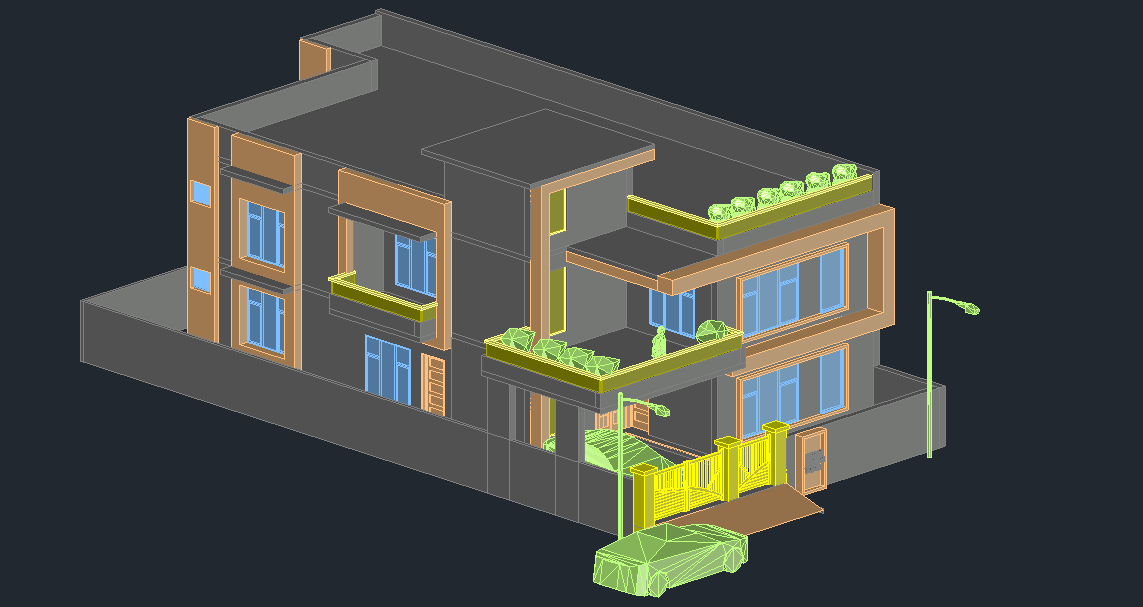 3D view of the 40’x75’ house plan is given in this Autocad drawing file. This is G+1 house plan. This is duplex house plan. The total built up area of the plan is 3000sqft. Car parking, street lamp, terrace level, water tank and other details are given. Download the 2D Autocad drawing file.