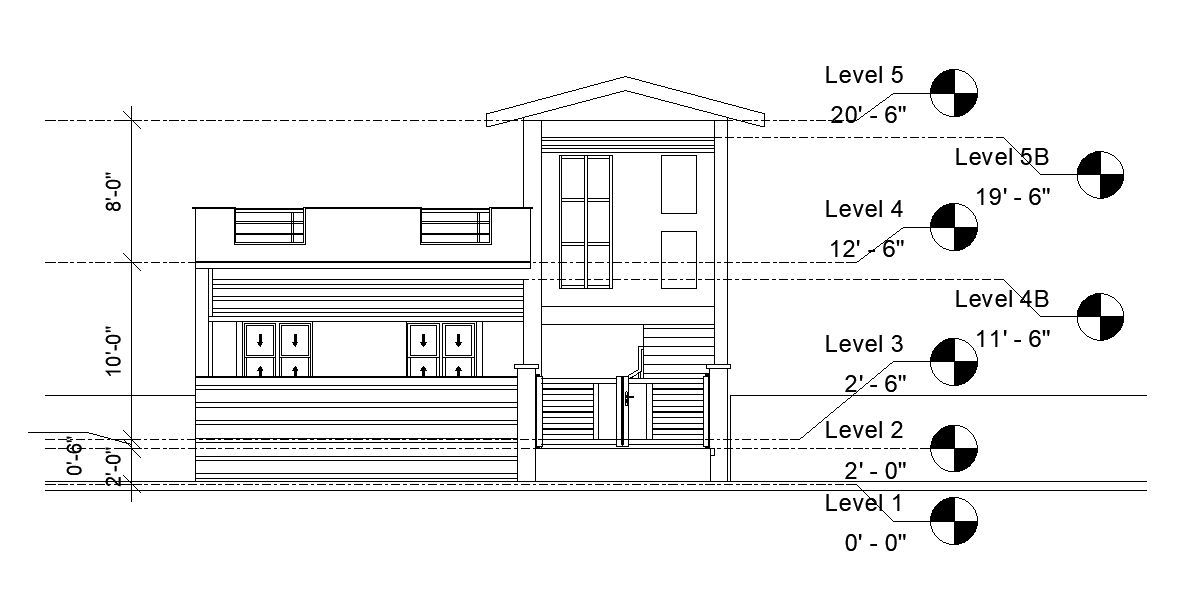 Left side elevation of the house plan is given in this 2D Autocad drawing file. Total height of the building is 20’. Ground level to terrace level height is 18’. Doors, windows, ventilation and entrance gate are available in this drawing model. Download the 2D Autocad drawing file.