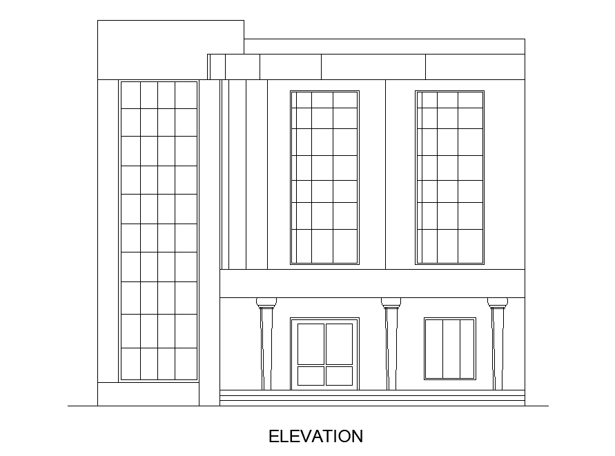 Bank front elevation detail drawing provided in this AutoCAD file. in this file, the front elevation given with a glass vertical window and column detail with the main entrance and specifications. this can be used by architects and engineers. Download this 2d AutoCAD drawing file.
