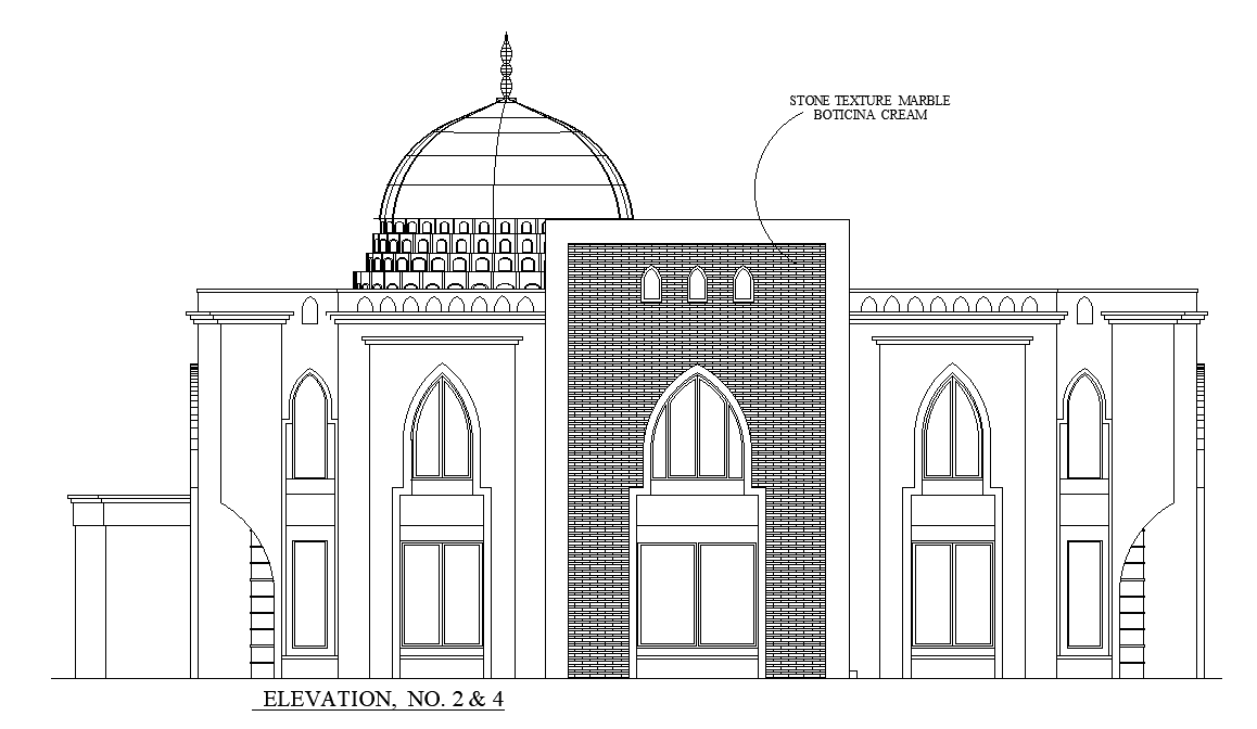 Side elevation of mosque detail drawing presented in this AutoCAD file. Download the AutoCAD file.