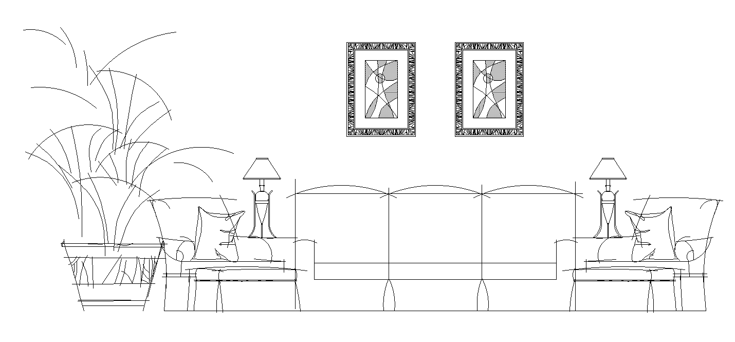 Sofa front elevation detail drawing specified in this AutoCAD file. this file consists of three sitter sofa with wall painting and night lamp block given in this file. this can be used by architects and engineers. Download this 2d AutoCAD drawing file.