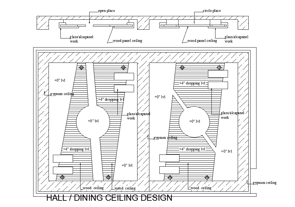 Ceiling design of hall and dining detail drawing presented in this AutoCAD file. this file consists of a hall and dining ceiling plan and section detail given with levels and material given in it. this can be used by architects and engineers. Download this 2d AutoCAD drawing file.
