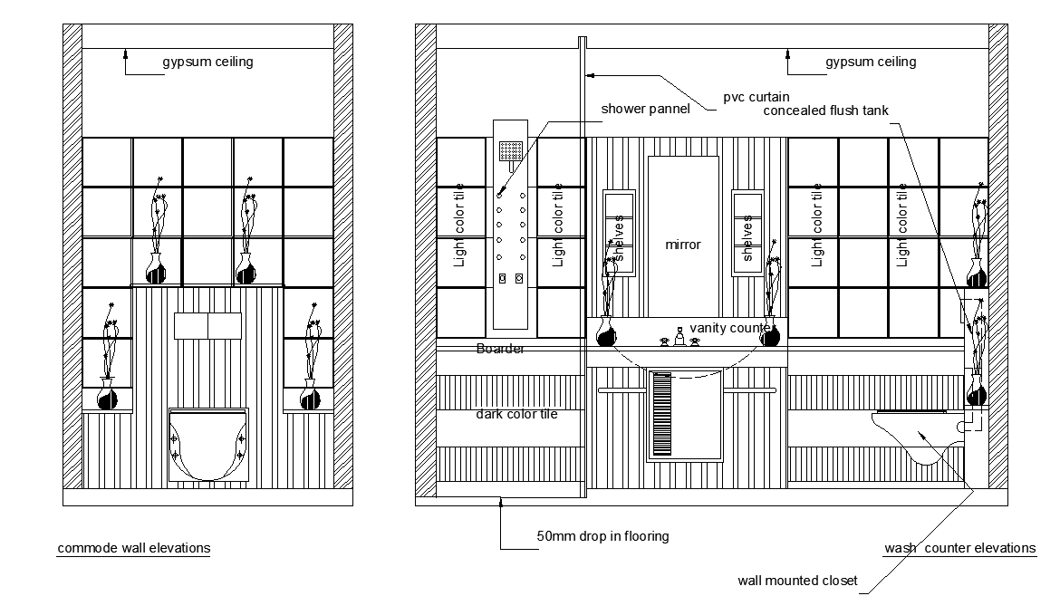 Luxurious toilet detail drawing specified in this AutoCAD file. this file consists of commode wall elevations and section detail like wall mounted closet, counter elevation, gypsum ceiling gave in this file.this can be used by architects and engineers. Download this 2d AutoCAD drawing file.