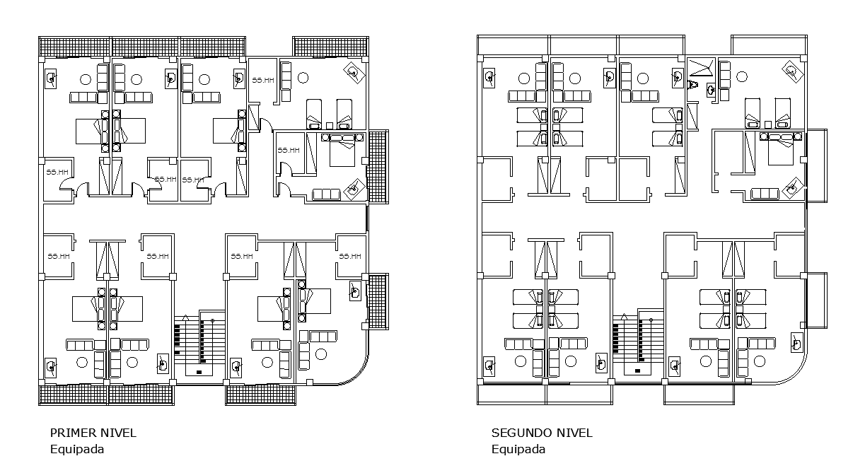 The architecture hotel bedrooms ground floor and first floor plan with furniture layout design that shows bedrooms with an attached toilet, living area, and double bed. Thank you for downloading the AutoCAD file and other CAD program from our website.