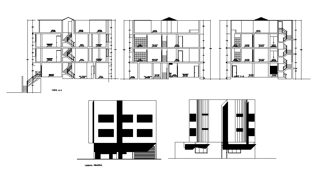 Section and elevation of typical floor plan of house plan is given in this 2D Autocad DWG drawing file. Download the Autocad file.