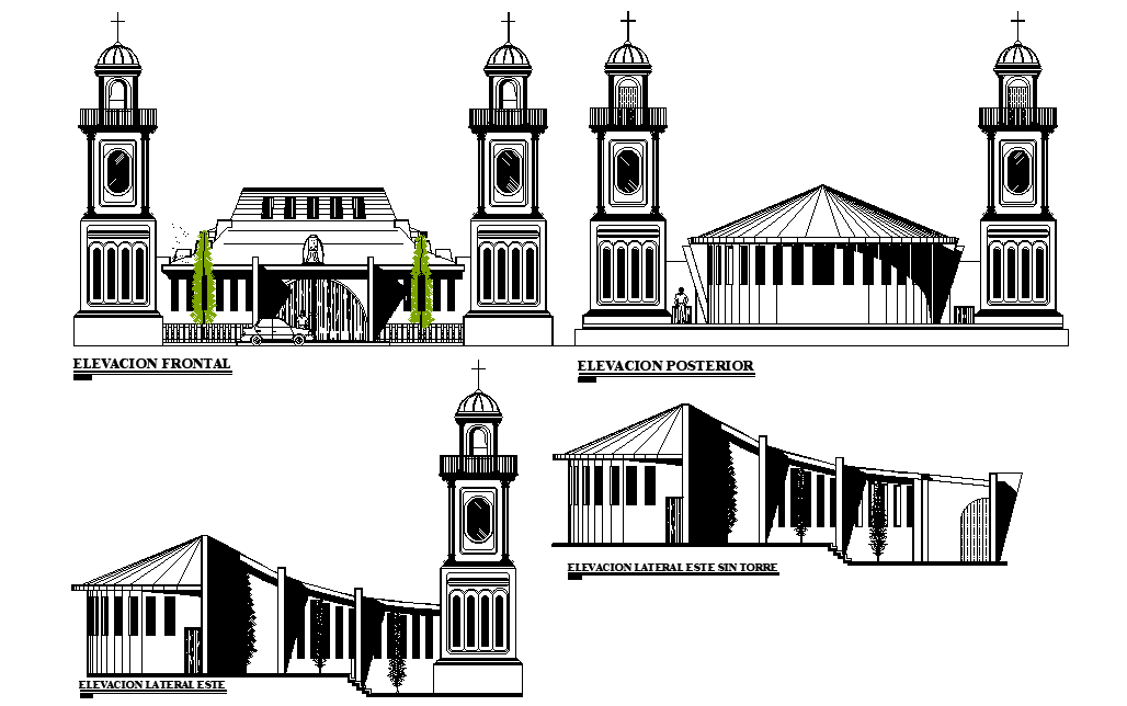 Front elevation of the church is given in this 2D Autocad DWG drawing file. Download the Autocad file.