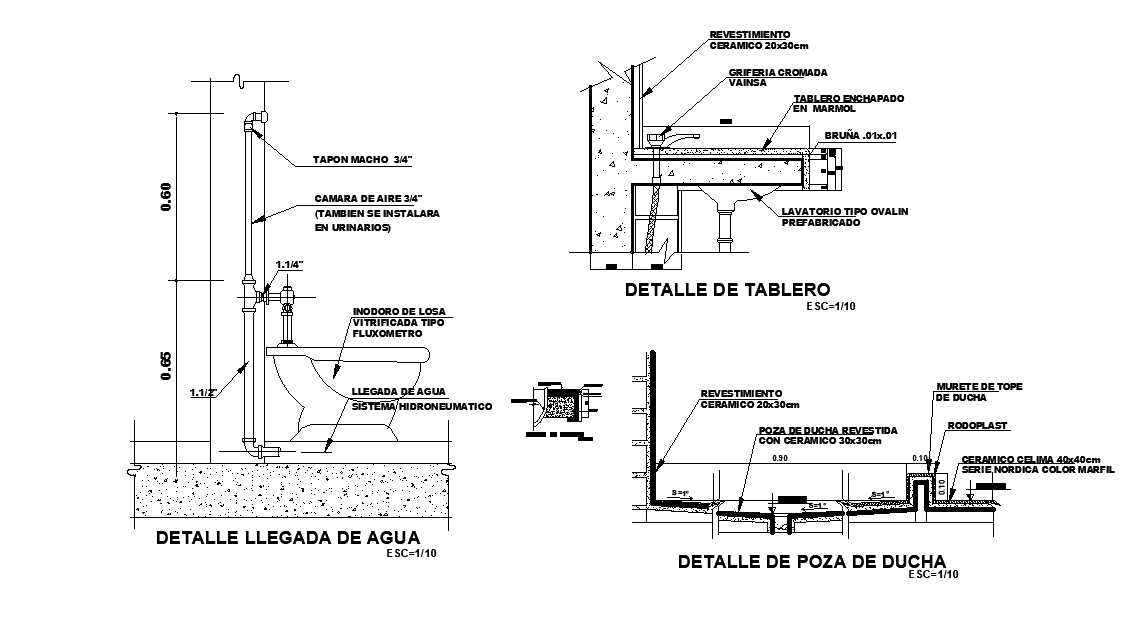 The sanitary ware toilet and wash basin installation with plumbing pipe line connection detail that shows fluxometer type glassed tile toilet, water inlet, hydro-pneumatic system, 20x30cm ceramic tiling, vainsa chrome tap, plated board in marble, ceramic celima 40x40cm ivory color nordica series and 30x30cm ceramic covered shower pool. Thanks for downloading the file and another CAD program from the cadbull.com website.