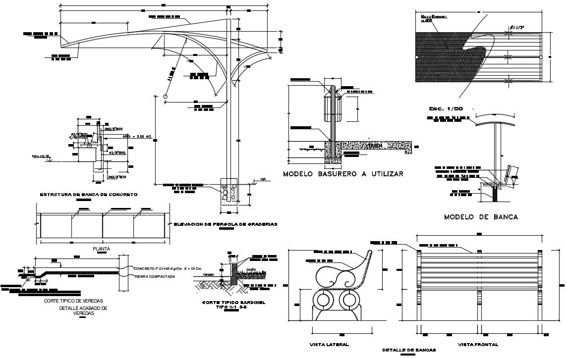 Park furniture detail drawing specified in this AutoCAD file. this file consists of bench detail, pole light detail, section detail of furniture given with dimensions, and specifications. this can be used by architects and engineers. Download this 2d AutoCAD drawing file.